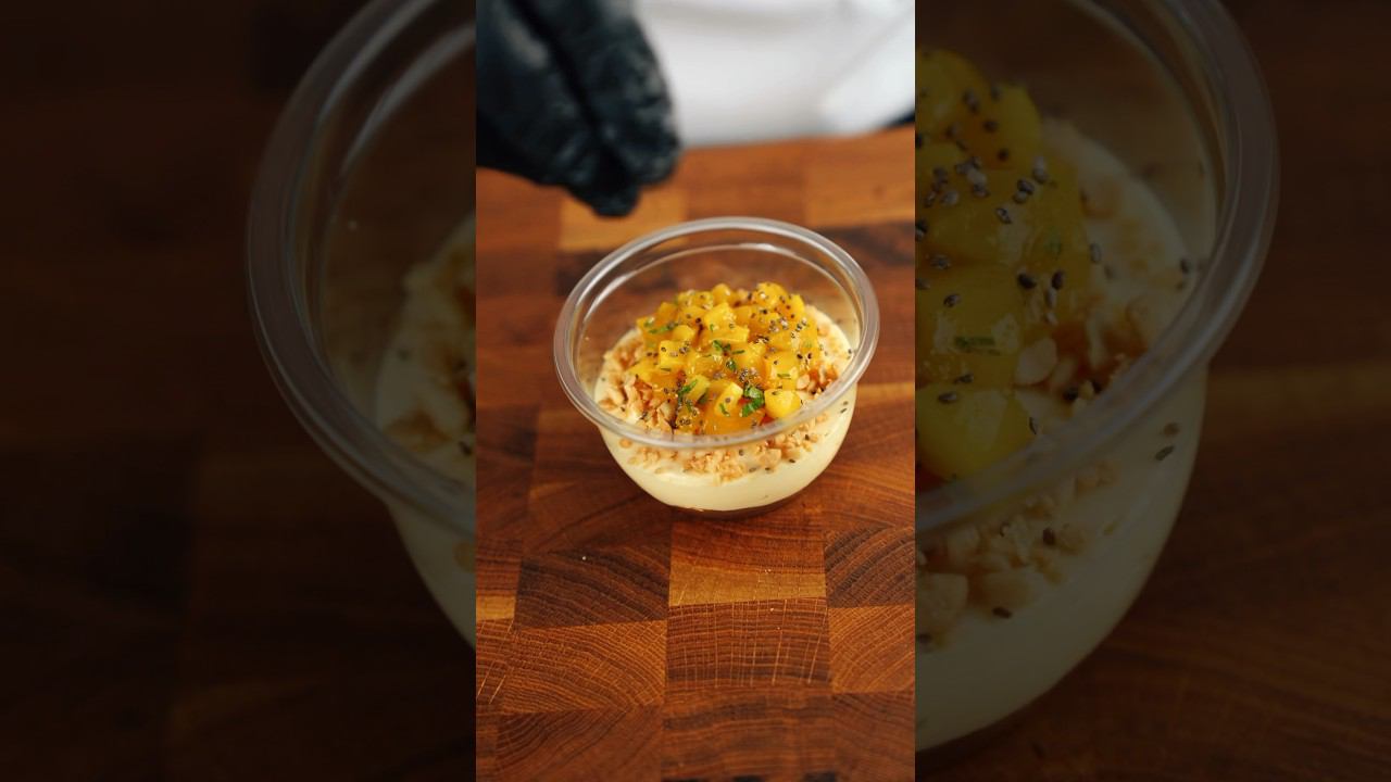 Крем манго-маракуйя, манго, арахис, песочная основа, сливочное масло, мята, семена чиа