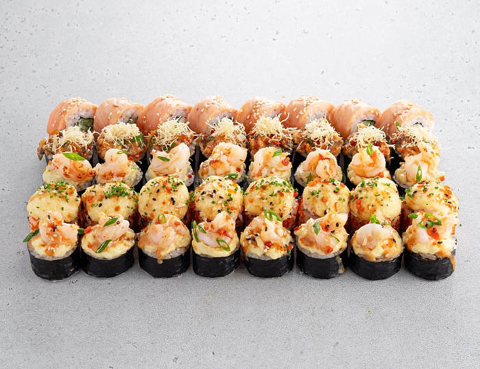 Горячие, хитовые, твои. Эта пятерка запеченных роллов никого не оставит равнодушным. Мясистая креветка, сочный краб, нежный угорь и лакомый лосось. Зачем выбирать что-то одно? Берите все!
