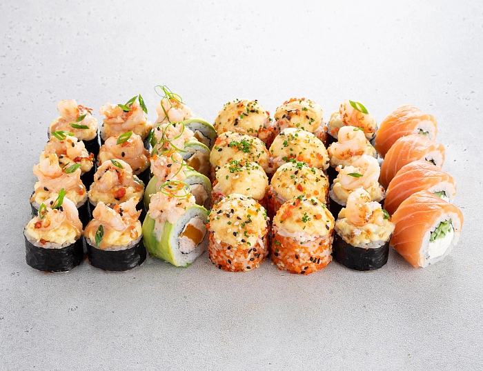 Собрали в одном наборе самые сливки нашего меню! Классическая Филадельфия, которая покоряет своей нежностью, необычная экзотика в виде ролла со спелым манго и три безусловных любимца среди запеченных роллов. Идеальное решение, когда хочется попробовать только лучших из лучших!