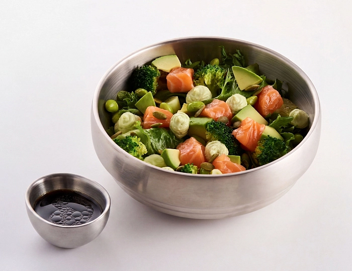 Лосось, авокадо, брокколи, крем из авокадо, салат фриллис, бобы эдамаме, салат ромейн, соус шисо, масло оливковое, тыквенные семечки