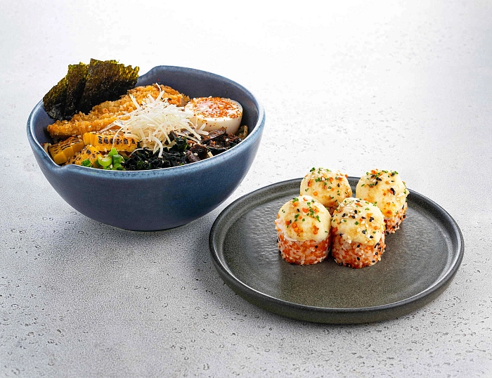 Если вы в поисках неприлично вкусного обеда – он найден! На первое – наваристый рамен с хрустящей курицей и кукурузой на гриле, на второе – хитовый запеченный ролл с крабом и пармезаном