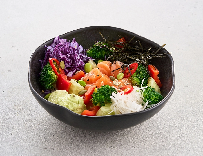 В лучших гавайских традициях! Рис и лосось заправляем соусом понзу на основе цитрусов, а затем добавляем крем из спелого авокадо, хрустящий брокколи, свежие огурцы и паприку. Оформляем все нашинкованной капустой и редькой дайкон и украшаем различными семенами и орехами. Такая многослойность вкусов сделает трапезу сытной и точно поднимет настроение. Попробуйте!