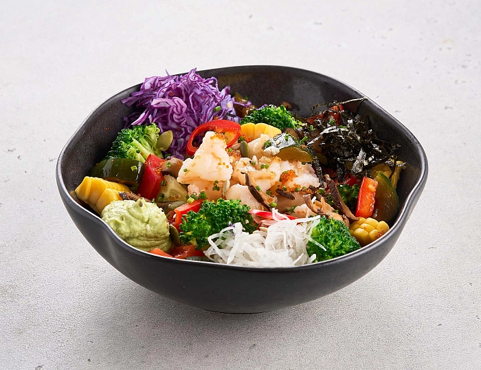 На подушку из риса выкладываем обжаренные в чесночном масле креветки, нарезанную капусту, сладкую кукурузу и крем из авокадо. Дополняем блюдо бобами эдамаме и грибами шиитаке для большей экзотичности. Украшаем все соломкой из водорослей нори, икрой масаго, семечками и семенами кунжута. В качестве заправки используем пикантный соус халапеньо.