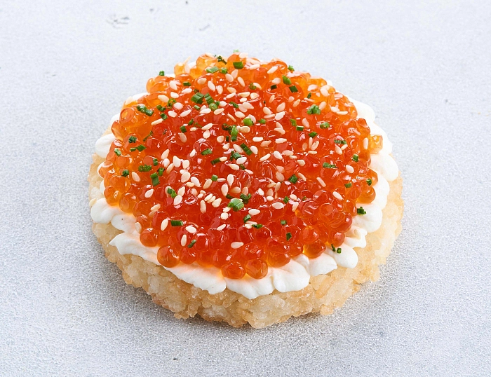 Икра горбуши, сливочный мусс, рис, лук шнитт, кунжут белый, крахмал кукурузный