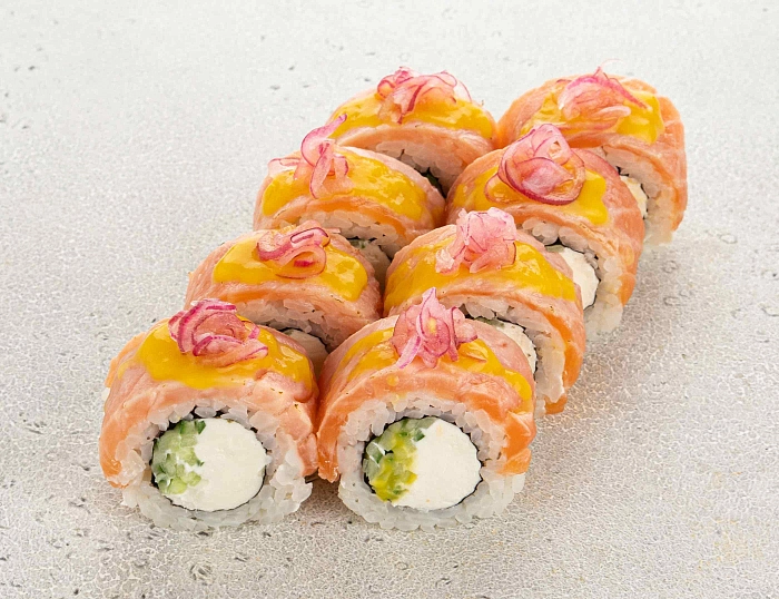 Нежная «Опаленная Филадельфия» с пикантным дополнением в виде маринованного лука, который покорил нас в путешествии по Японии, и сладкого соуса манго, объединяющего это уникальное сочетание.