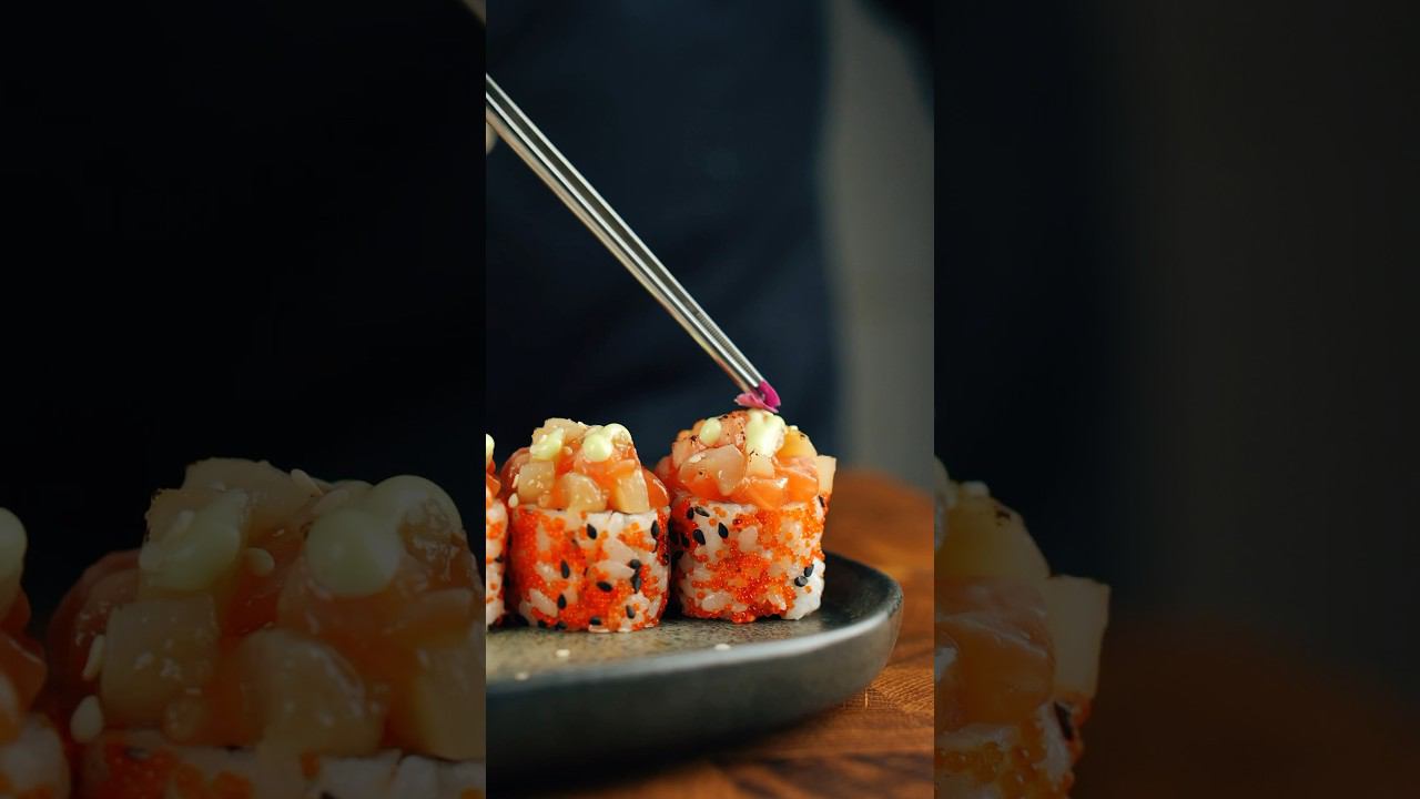 Начинку из нежного сливочного сыра и хрустящего огурца аккуратно обнимает рисовое одеяло с вкраплением из бисера икры тобико и черного кунжута. В шапочке кусочки опаленного лосося и морского гребешка в паре с соусами унаги и васаби. Завершается произведение лепестками китайской чайной розы.