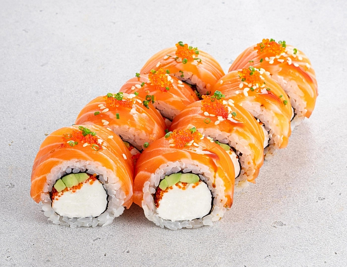 Классика в новом прочтении. К знакомым вкусам атлантического лосося и сливочного сыра добавили спелый авокадо и солоноватую икру тобико.