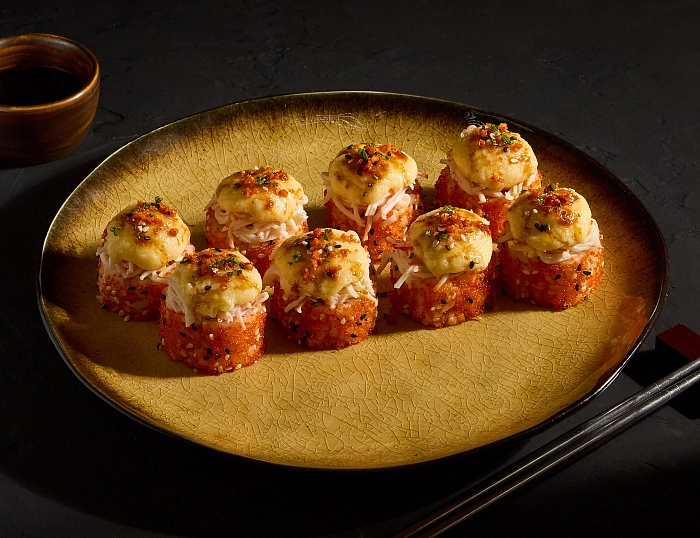 Рис, нори, снежный краб, соус айоли, пармезан, сливочный сыр, омлет тамаго, salmon skin, икра тобико, унаги соус, кунжут микс, китайский перчик, лук шнитт