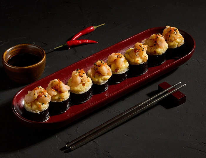 Креветка в чесночном масле, снежный краб, рис, нори, соус шрирача, сыр гауда, соус унаги, китайский перчик с арахисом, сырный соус, чесночный соус, соус шичими, кунжут, зеленый лук