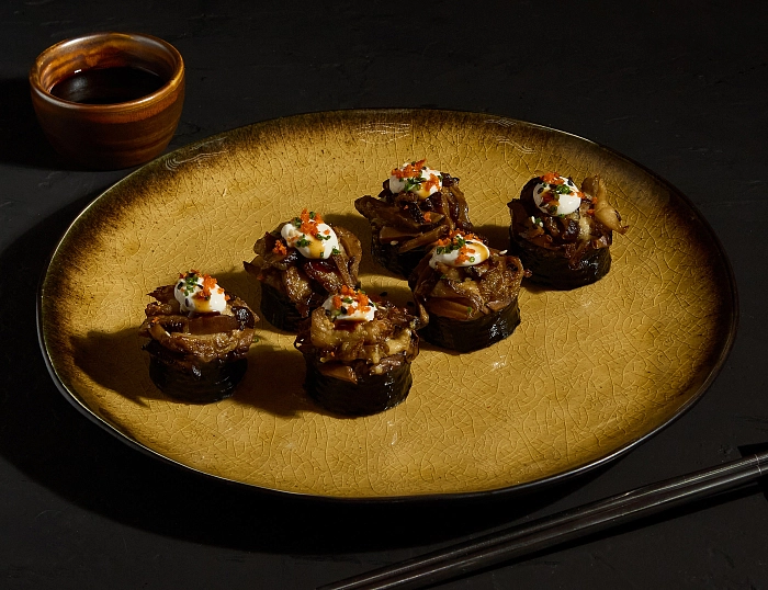 Его главная задача — никого не оставить равнодушным. Нежнейший ролл со снежным крабом и свежим огурцом в начинке. Никакого риса, только сочность и легкость. Сверху — шапочка из грибов шиитаке, ароматных вешенок, сыра гауда и микса соусов: сырного, унаги, пармезана и того самого трюфельного. Завершают картину китайский перец, кунжут и зеленый лук. Предупреждаем: остановиться не получится.