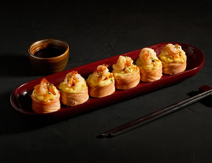Всё, что вы любите, но совершенно под другим углом. Теплые слайсы атлантического лосося обнимают начинку из сливочного сыра cremette и хрустящего огурца. В шапочке восседает мясистая креветка, а сладкий соус унаги, нежный сырный и жгучий шичими создают идеальный баланс вкуса и пикантности.