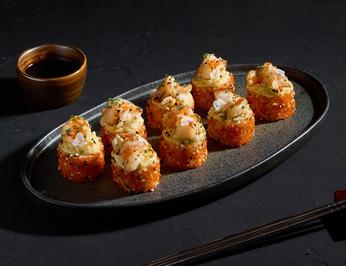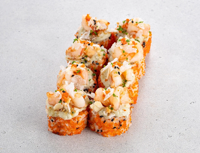 Один укус — и в вас просыпается гурман. А как иначе, когда в шапочке мясистая тигровая креветка и та самая горгонзола — нежная, сливочная, с пикантными нотками голубого сыра? Начинка ничуть не уступает: любимый сыр cremette, воздушный омлет тамаго и salmon skin. Запекаем до золотистости, приправляем сладким унаги и завершаем картину декором: перчиком, луком шнитт и арахисом.