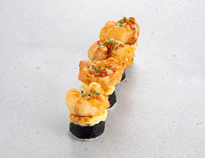 Когда хочется похрустеть чем-то горячим и сочным. В начинке сливочный сыр, воздушный омлет тамаго и salmon skin. Нежную сырную шапочку украшает мясистая тигровая креветка, а за яркие акценты отвечают соус унаги и шичими. Осторожно: вызывает удовольствие.