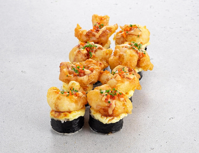 Когда хочется похрустеть чем-то горячим и сочным. В начинке сливочный сыр, воздушный омлет тамаго и salmon skin. Нежную сырную шапочку украшает мясистая тигровая креветка, а за яркие акценты отвечают соус унаги и шичими. Осторожно: вызывает удовольствие.