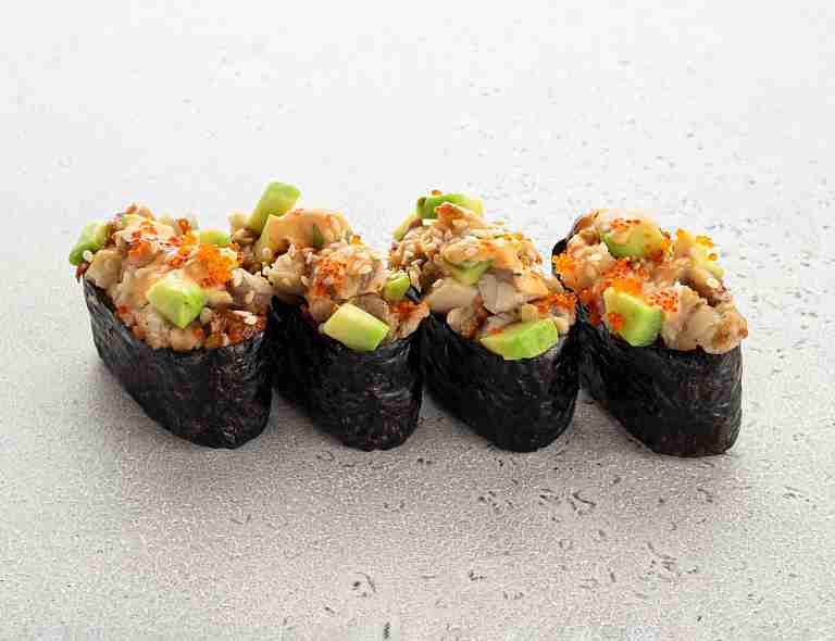 Вариант классики для всех любителей поострее: правильно приготовленный рис, обернутый листом нори и ваш любимый морепродукт в остром спайси соусе с капелькой унаги.