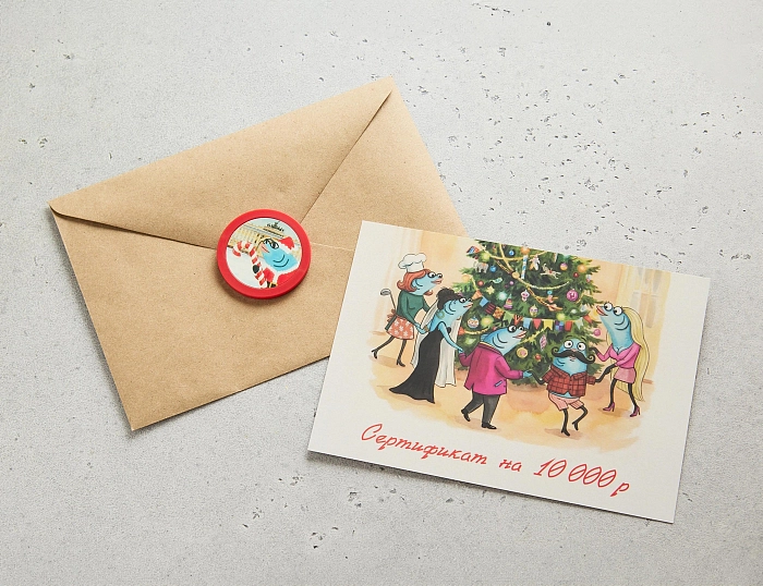 Не просто подарок, целая новогодняя история: сертификат на любимые роллы, праздничный конверт и vipfishka — сотрите ей скретч-зону, откройте промокод, и случится вкусная магия.